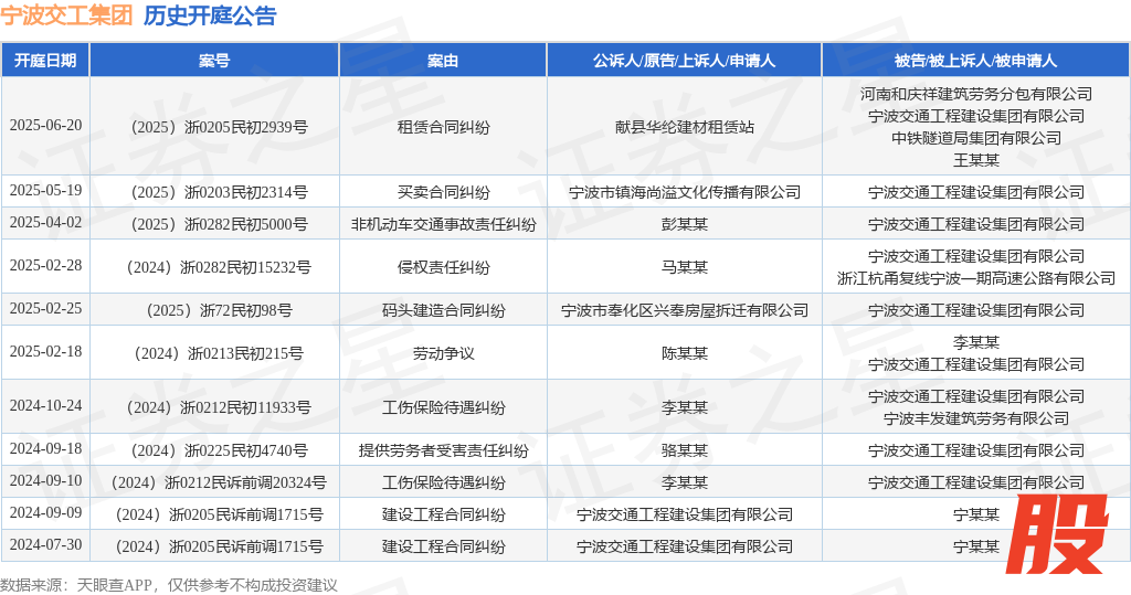 案号:(2025)浙0205民初2939号审理法院:宁波市江北区人民法院案由:租赁合同纠纷当事人信息: 原告/上诉人:献县华纶建材租赁站 被告/被上诉人:河南和庆祥建筑劳务分包有限公司、宁波交通工程建设集团有限公司、中铁隧道局集团有限公司、王某某开庭日期:2025年6月20日根据统计,近一年内以宁波交通工程建设集团有限公司为当事人的历史开庭公告有11则,其中案由为“工伤保险待遇纠纷”的公告以2则居首,其次为“建设工程合同纠纷”有2则,“买卖合同纠纷”有1则。历史开庭公告如下: