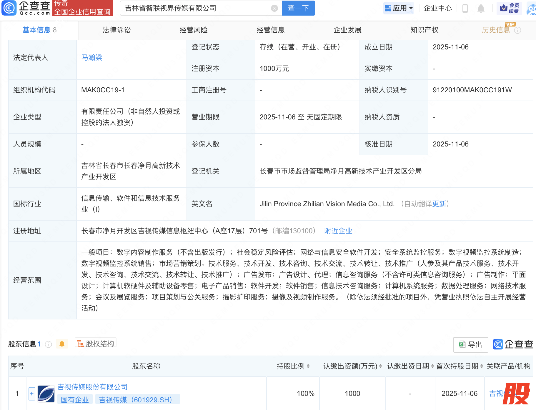 近日,吉林省智联视界传媒有限公司成立,注册资本1000万元,经营范围包含:网络与信息安全软件开发;安全系统监控服务;数字视频监控系统制造等。企查查股权穿透显示,该公司由吉视传媒(601929)全资持股。