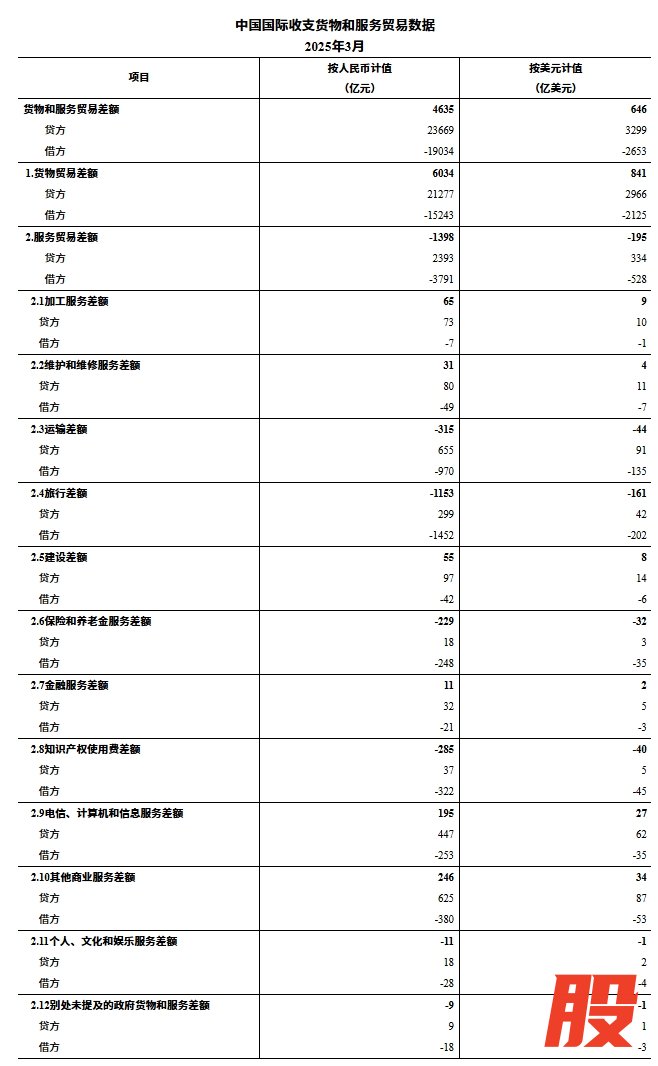 国家外汇管理局统计数据显示,2025年3月,我国国际收支货物和服务贸易进出口规模42704亿元,同比增长6%。其中,货物贸易出口21277亿元,进口15243亿元,顺差6034亿元;服务贸易出口2393亿元,进口3791亿元,逆差1398亿元。服务贸易主要项目为:旅行服务进出口规模1751亿元,运输服务进出口规模1626亿元,其他商业服务进出口规模1005亿元,电信、计算机和信息服务进出口规模700亿元。按美元计值,2025年3月,我国国际收支货物和服务贸易出口3299亿美元,进口2653亿美元天策吧,顺差646亿美元。