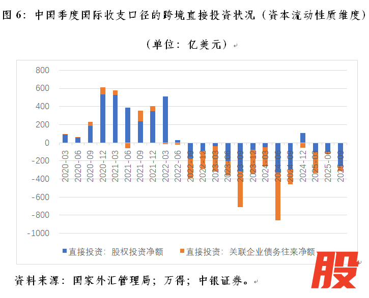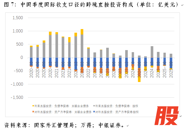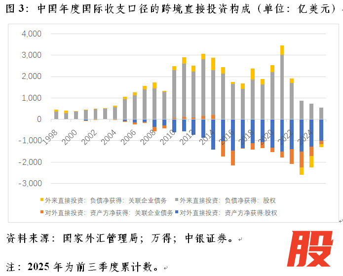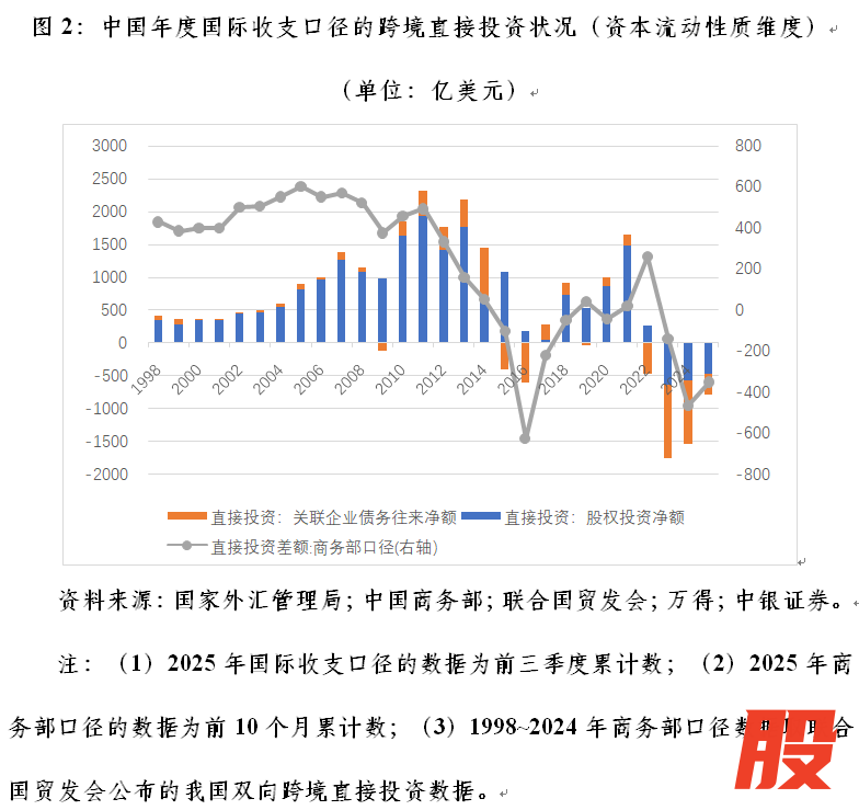 从资本流动性质的角度看,这主要是因为股权投资和关联企业债务往来双双急剧逆转。2021~2024年,股权投资由净流入1482亿转为净流出572亿美元,净流出增加2054亿美元,贡献了64.4%;关联企业债务往来由净流入171亿转为净流出965亿美元,净流出增加1135亿美元,贡献了35.6%,这或反映了2022年以来中外利率倒挂,人民币成为重要跨境融资货币的影响。有必要指出的是,虽然自2015年以来,我国商务部口径的跨境直接投资经常性地出现对外直接投资大于外商直接投资、跨境直接投资净流出的情况,国际收支口径可比的跨境直接投资项下的股权投资直到2023年起才连续出现负值(图2)。